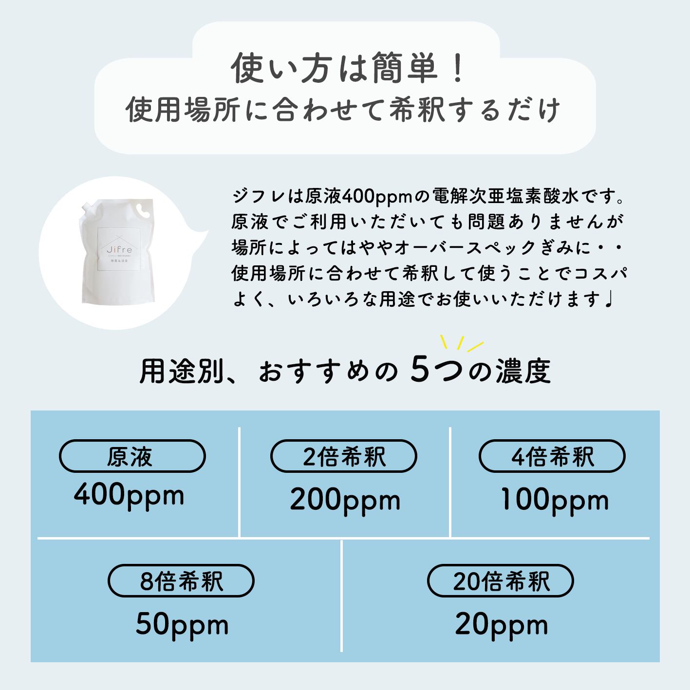 100~200ppm (希釈2倍~4倍):調理器具の除菌 / トイレの除菌消臭 / 生ごみやオムツなどの除菌消臭 / ウイルス対策 / ペットの消臭