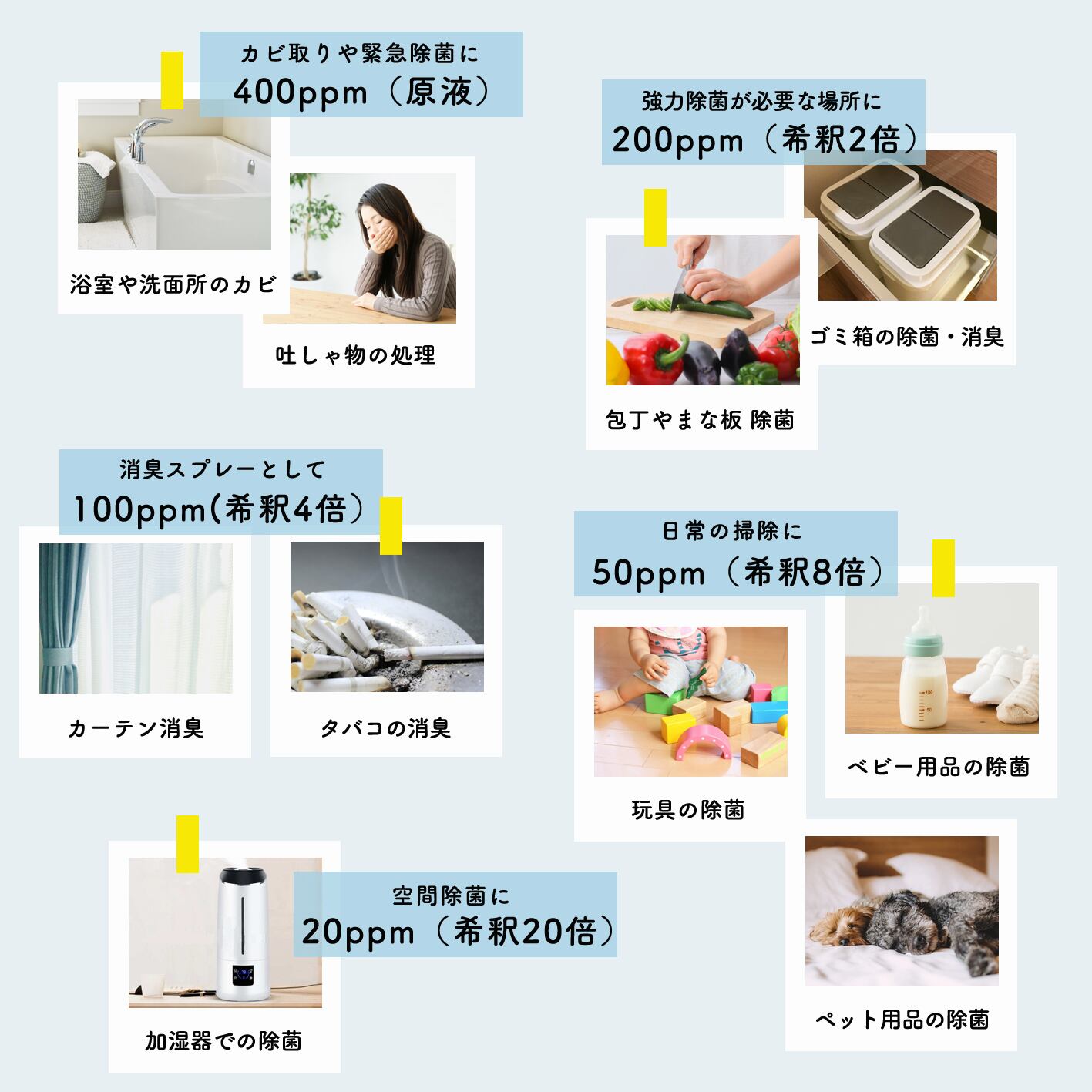 電解次亜塩素酸水:有効HCIO濃度400ppm ( 生成時 )